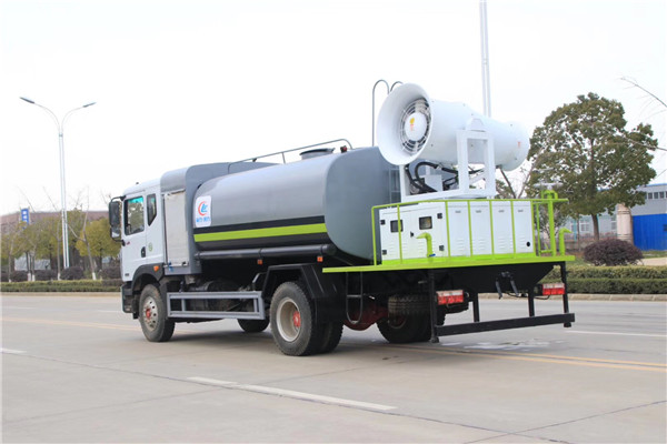 改裝配置:罐體用4MM碳鋼板制作,罐內隔板具有防波作用,以減低灑水車行駛時罐體液體的沖擊。整車帶一個專用灑水泵(垂直最大吸程6米),灑水寬度14米,射程28米。多功能灑水車配備2個前沖(噴)(能將路面泥巴、塵土、垃圾沖干凈);2個后灑(能均勻地將水灑在路面,一次灑水寬度14米)、2個側噴(花灑)(能均勻地將路旁綠化帶澆灌)、帶1個后工作平臺,平臺上安裝1個綠化灑水高炮(灑水炮可全方位旋轉,可連續調成直沖狀、大雨、小雨、毛毛雨,霧狀可調節沖洗高大樹木),引水時間<5min,流量90m3/h。帶1個消防接頭,帶1個自流閥,1個過濾裝置、人性化爬梯及側防護欄,安裝灑水音樂喇叭。
