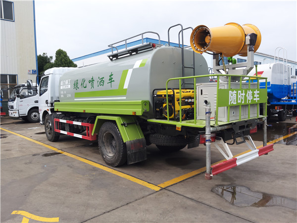 罐體用4MM碳鋼板制作,罐內(nèi)隔板具有防波作用,以減低灑水車行駛時罐體液體的沖擊。整車帶一個專用灑水泵(垂直最大吸程6米),灑水寬度14米,射程28米。多功能灑水車配備2個前沖(噴)(能將路面泥巴、塵土、垃圾沖干凈);2個后灑(能均勻地將水灑在路面,一次灑水寬度14米)、2個側(cè)噴(花灑)(能均勻地將路旁綠化帶澆灌)、帶1個后工作平臺,平臺上安裝1個綠化灑水高炮(灑水炮可全方位旋轉(zhuǎn),可連續(xù)調(diào)成直沖狀、大雨、小雨、毛毛雨,霧狀可調(diào)節(jié)沖洗高大樹木),引水時間<5min,流量90m3/h。帶1個消防接頭,帶1個自流閥,1個過濾裝置、人性化爬梯及側(cè)防護欄,安裝灑水音樂喇叭。