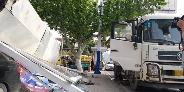在現場看到,闖禍的洗掃車,停在東側的非機動車道上,而旁邊被撞的公交站臺已經倒地,站臺棚損毀嚴重,站臺下面還砸著一輛黑色私家車。