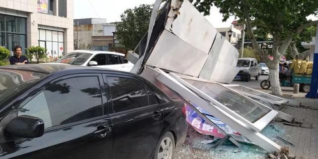 洗掃車司機說:“我每天都開車沿魏武大道東側的非機動車道清掃,但今天下午3點鐘左右,因為躲避一輛三輪車,無意間撞倒了站臺上的棚頂,而且旁邊停放的這輛黑色私家車也被砸壞。”
