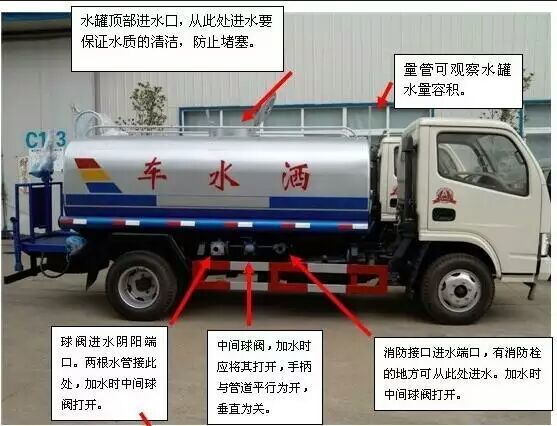 灑水車前裝有鴨形噴嘴或圓頭沖嘴,后面裝有圓柱開灑水噴嘴或蓮蓬頭噴嘴,后部有一工作平臺,裝配有水炮。后部還可裝8個噴嘴(選裝)噴水器一般用于沖洗街道,起除塵和降溫作用,其噴水器可以用調(diào)節(jié)噴嘴螺紋的方法改變噴水器的噴灑方向和角度,高射水炮可以用于城鄉(xiāng)園林綠化及應(yīng)急消防。蓮蓬嘴可以澆落路中間噴水器沖起的灰塵,起到清潔空氣的作用。