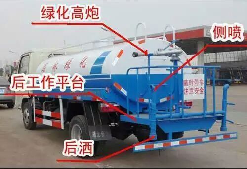 改裝配置:罐體用4MM碳鋼板制作,罐內(nèi)隔板具有防波作用,以減低汽車行駛時(shí)罐體液體的沖擊。整車帶一個(gè)專用灑水泵(垂直最大吸程6米),灑水寬度14米,射程28米。多功能灑水車配備2個(gè)前沖(噴)(能將路面泥巴、塵土、垃圾沖干凈);2個(gè)后灑(能均勻地將水灑在路面,一次灑水寬度14米)、2個(gè)側(cè)噴(花灑)(能均勻地將路旁綠化帶澆灌)、帶1個(gè)后工作平臺(tái),平臺(tái)上安裝1個(gè)綠化灑水高炮(灑水炮可全方位旋轉(zhuǎn),可連續(xù)調(diào)成直沖狀、大雨、小雨、毛毛雨,霧狀可調(diào)節(jié)沖洗高大樹木),引水時(shí)間<5min,流量90m3/h。帶1個(gè)消防接頭,帶1個(gè)自流閥,1個(gè)過(guò)濾裝置、人性化爬梯及側(cè)防護(hù)欄,安裝灑水音樂(lè)喇叭。
