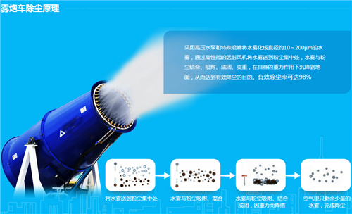 抑塵機是根據(jù)風送原理,先使用進口高壓泵、微細霧化噴嘴將水霧化,再利用風機風量和風壓將霧化后的水霧送到較遠距離,使得水霧到達較遠距離同時能夠覆蓋更大面積,水霧與粉塵凝結(jié)后降落,從而達到降塵目的。