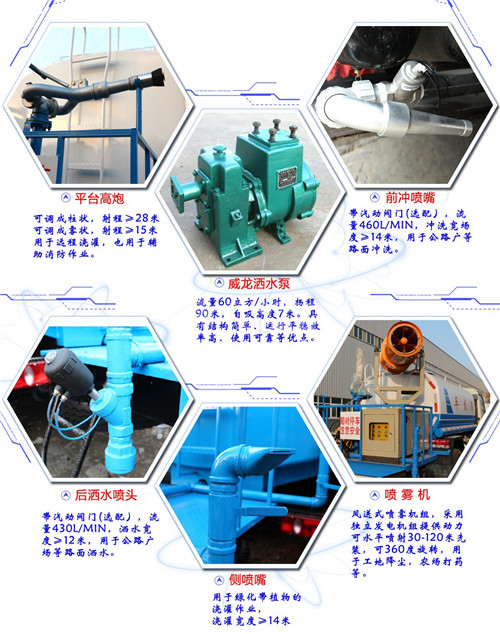 罐體:采用武鋼生產(chǎn)的Q235優(yōu)質(zhì)碳鋼板制作,罐體有效容積12立方,可選圓形罐體或方形罐體,帶前沖后灑、側(cè)噴功能,尾部帶工作平臺(tái),平臺(tái)上安裝綠化高炮,垂直吸程6.5米,揚(yáng)塵14米,帶消防接口、自流閥,可自吸自排。噴霧機(jī)組:尾部裝高效率噴霧式車(chē)載風(fēng)機(jī),霧炮射程可達(dá)30-80米,柴油發(fā)電機(jī)組,電子搖控操作,可上下左右自動(dòng)搖動(dòng)噴霧,實(shí)現(xiàn)360度旋轉(zhuǎn)。