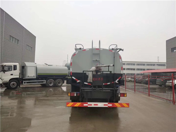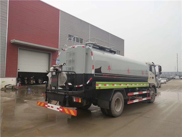 原廠灑水車上裝配置:罐體容積為15立方灑水車,罐體鋼板為4mm碳鋼Q235材質,罐內隔板具有防波作用,以減輕汽車行駛時罐體液體沖擊,罐體及整車外形尺寸按照公告。帶大功率專用灑水泵,泵可自吸自排,整車前沖、后灑、側噴、帶65消防接口,后平臺帶綠化灑水炮,灑水炮可全方位旋轉,可連續調成直沖狀、大雨、小雨、毛毛雨;前封頭帶水位計,后平臺主管路帶1寸澆花接口,后爬梯。平臺后部帶小安全告知牌:“隨時停車,注意安全”,帶兩根水管及陰陽端。罐體顏色:上白/下藍,銀灰/銀藍,罐體兩側噴“灑水車、綠化噴灑車”字樣,貼反光標示。