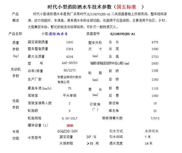 采用東風(fēng)多利卡底盤(pán)EQ1110TFJ,單排或排半駕駛室,配備朝柴120馬力國(guó)五發(fā)動(dòng)機(jī),825-16輪胎,外形尺寸7650×2300×3170(mm),消防泵后置帶卷簾門(mén),水罐容積6.5立方米,東風(fēng)消防水車(chē)配備20或30消防泵和消防炮,射程≥45米,消防灑水車(chē)可用于森林消防滅火,社區(qū),村鎮(zhèn)等一般性消防戰(zhàn)備滅火,同時(shí)也可以用于綠化灑水,抗旱供水運(yùn)水等。該車(chē)罐體有效容積:6噸-8噸,該車(chē)帶國(guó)家免征公告。帶專(zhuān)用灑水泵,可自吸自排,帶前沖后灑,側(cè)噴,后工作平臺(tái)上配灑水高炮.