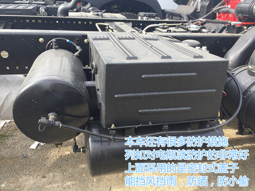 本車還有很多防護措施,列如對電瓶就防護的非常好,上面采用的是密封式蓋子,能擋風擋雨,防曬,防小偷,電瓶旁邊是兩個氣缸,這兩個氣缸就是斷氣剎儲存氣用的,只要壓力達到6才能起步,才能才剎車,斷氣剎比油剎的好處就是能長時間踩剎車,剎車不會軟綿綿的。也是長時間行駛最好的選擇。
