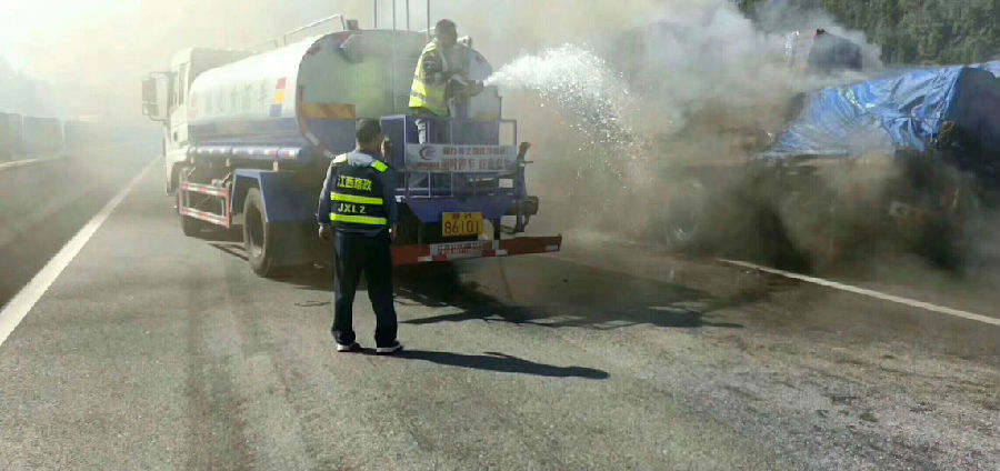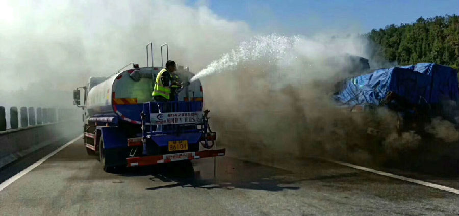 事情是這樣的,南昌的劉老板正在江西某告訴路上進行樹木養護灌溉,(大家肯會問南昌的劉老板咋跑江西告訴上養護樹木了,那是應為南昌的劉老板進行招標,贏得了江西某告訴路段的養護)今天剛好在告訴路上進行樹木養護,看見前方路段冒起了濃煙滾滾的,根據劉老板多年的經驗,一看就知道前方發生了火災,這位劉老板不管是森林火災還是車輛火災,都要前去滅火,(大家都知道火在不管的情況下,才能變成火災,只要把火在剛開始燃燒的時候給滅掉就不會發生火災)這劉老板一過去就看見一輛半掛車在燃燒,這是的火還不是非常大,還是非常危險的,這劉老板不更具自己多年的經驗判定火勢自己的灑水車能把火給滅了,上去就加大馬力,利用灑水車水炮進行滅火,經過半小時火勢給控制住了,只剩濃煙,劉老板這不能松懈一定要等消防隊來啦交給消防隊才能放心,就在旁邊進行霧狀噴水,(大家都知道灑水車水炮是有兩種用途的,一種是水柱狀,這書水炮在水柱狀時是能消防滅火的,射程能達到35米,大家也要注意沖擊力大有危險,不要對準人只用。二是霧狀,灑水車水炮霧狀時能降低空氣里面的粉塵,是分解濃霧的最得力的幫手。)