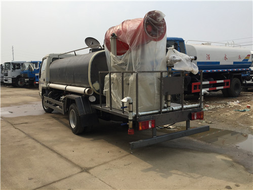 在常規(guī)灑水車的基礎上,加裝了抑塵噴霧系統(tǒng),外接的380V配套動力組把罐體內的水霧最大霧化作業(yè)行程高達20-100米,穿透性好,作業(yè)效率高,大大降低了勞動力成本??蓪γ憾褔姙⒁謮m劑、固化劑,使得煤灰不會被風吹起,降低空氣粉塵污染。采用了遙控操作指揮系統(tǒng),可360度旋轉,兼具綠化噴灑,消防應急,除塵降塵,噴藥消毒等功能,遠程遙控,使用方便。