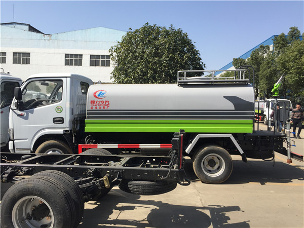 小多利卡5方灑水車(罐體容積:5立方):該車采用東風朝陽柴油發動機,一汽錫柴柴油發動機和昆明云內柴油發動機,白色前翻駕駛室,7.00-16輪胎,汽剎, 5檔變速箱,2噸前橋,4噸后橋,整車外形尺寸:長×寬×高(mm) 5990/1980/2390,總質量(kg)7360,額載質量(kg)3870。罐體有效容積:5噸,帶國家免征公告。