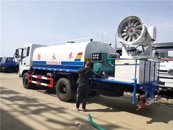 東風12噸抑塵車選配50米噴霧機達到除塵效果。霧炮機是根據風送原理,先使用進口高壓泵、微細霧化噴嘴將水霧化,再利用風機風量和風壓將霧化后的水霧送到較遠距離,使得水霧到達較遠距離同時能夠覆蓋更大面積,水霧與粉塵凝結后降落,從而達到降塵目的。