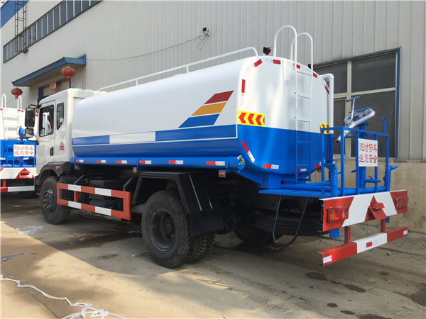灑水車前裝有鴨形噴嘴或圓頭沖嘴,后面裝有圓柱開灑水噴嘴或蓮蓬頭噴嘴,后部有一工作平臺,裝配有水炮。后部還可裝8個噴嘴(選裝)噴水器一般用于沖洗街道,起除塵和降溫作用,其噴水器可以用調節噴嘴螺紋的方法改變噴水器的噴灑方向和角度,高射水炮可以用于城鄉園林綠化及應急消防。蓮蓬嘴可以澆落路中間噴水器沖起的灰塵,起到清潔空氣的作用。