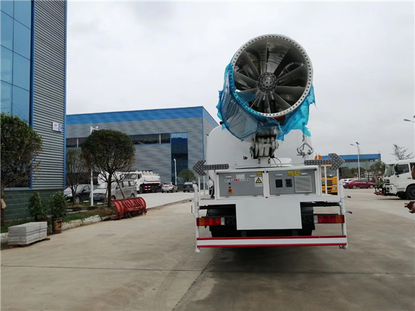 抑塵車的抑塵效果卻十分驚人,工作效率約為普通灑水車的30倍。水箱中的水經過霧化后,由高壓風機噴出。相比普通灑水車噴出的水流,降塵噴霧車可噴射微米級水霧,其吸附力也增加了3倍,耗水量卻降低了70%