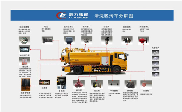 高壓清洗吸污車采用國內技術領先的吸污車真空泵,吸力大,吸程遠,特別適合用于下水道內的淤積物的抽吸、裝運和排卸,可吸下水道泥漿、淤泥、石子、磚塊等較大物體;尤其是蓄水池里的泥漿,原油,碎石,城市下水道不便人工進行清理或人工清理困難的地方,用吸污車來清理比較方便。緊急情況下可以用作灑水車,吸糞車,運水車(內部清理干凈即可),消防車。