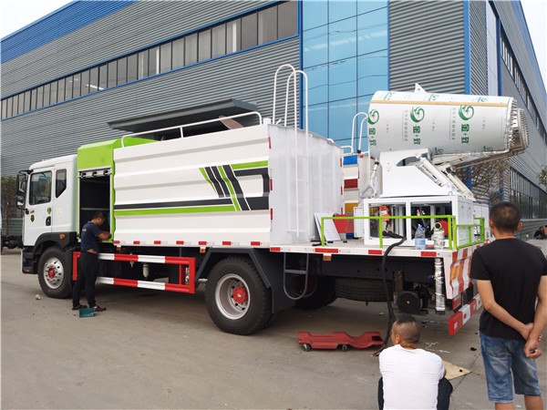 霧炮抑塵車操作系統(tǒng):主要由發(fā)動機帶動變速箱,變速箱上安裝的取力器帶動灑水泵,灑水泵產(chǎn)生動力,將罐體內(nèi)部的液體通過管網(wǎng)噴灑出去。工作范圍:自吸高度:≤7m,灑水寬度:≥14m,最