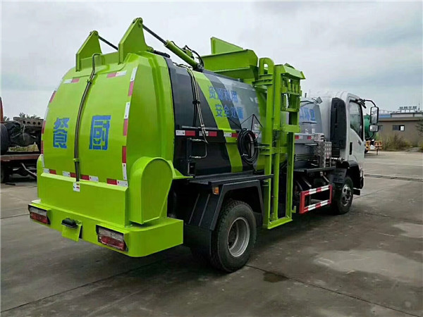 后帶垃圾斗翻轉機構:這款餐廚垃圾車主要工作原理為清潔工將收集好的垃圾集中倒在垃圾翻轉斗里,當填料斗裝滿垃圾后,刮板打開,滑板帶動刮板一起向下移動,插入垃圾中進行破碎和首次壓縮,刮板向前回轉,進一步壓實垃圾,刮板到位后隨滑板向上移動,將垃圾壓實并裝填到垃圾箱中,然后回到起始位置。整個工作過程自動控制,在垃圾連續(xù)不斷的壓填時,推鏟在擠壓力的作用下,克服背壓逐步后退,實現(xiàn)垃圾雙向壓縮并均勻充滿整個垃圾箱。