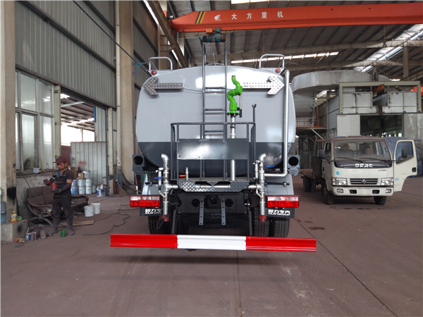 湖北武漢灑水車前裝有鴨嘴型噴霧或圓頭沖嘴,后面裝有圓柱形灑水砣,側噴花灑蓮花頭,車后部裝有高射噴槍。