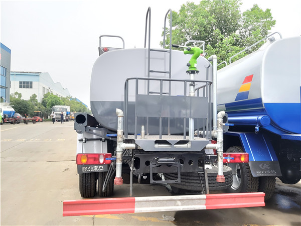前沖(噴),后灑,帶側噴,后置工作平臺,平臺上安裝綠化灑水高壓炮(炮噴射形狀可調成直沖狀、大雨、中雨、毛毛雨、炮可360度旋轉,射程>35米)。帶自流閥,消防接口。帶自吸泵,可將池塘的水直接吸入罐體內也可直接從城市街道消防栓上連接注水,吸入罐體內。罐前量管(觀察罐內水位)、罐后爬梯、罐上罐口帶簡易護欄、罐側雙炮筒、6米長4寸鋼絲塑膠管兩根,灑水車罐體表面雙層油漆工藝,防銹、耐腐蝕,其余有廠家標配??蛇x擇加裝加裝藥盤、氣動控制閥、噴藥設備、罐內防腐等。灑水車也可做噴藥車使用,可根椐用戶要求進專業噴藥防腐處理,也可做企業單位運水用,緊急時可做消防車使用。