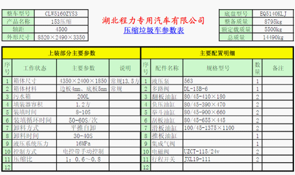 以下為東風153壓縮式垃圾車上裝部分主要技術參數: