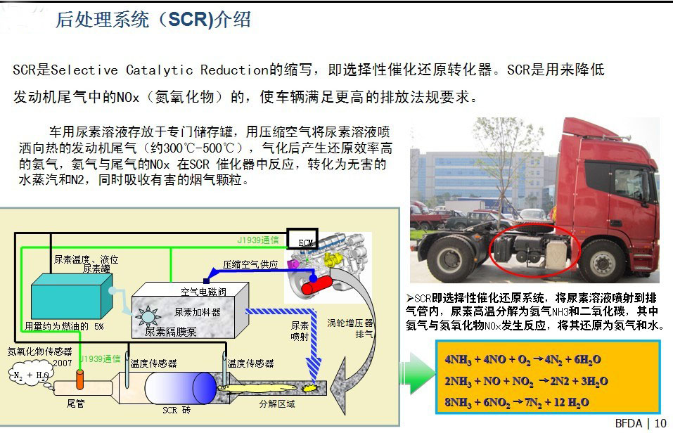 電控+SCR技術(shù)是通過(guò)使用選擇性催化還原(SCR)技術(shù),利用尿素溶液對(duì)尾氣中的氮氧化物進(jìn)行處理。車用尿素溶液存放于專門儲(chǔ)存罐,用壓縮空氣將尿素溶液噴灑向熱的發(fā)動(dòng)機(jī)尾氣(約300℃-500℃),氣化后產(chǎn)生還原效率高的氨氣,氨氣與尾氣的NOx 在SCR 催化器中反應(yīng),轉(zhuǎn)化為無(wú)害的水蒸汽和N2,同時(shí)吸收有害的煙氣顆粒;SCR即選擇性催化還原系統(tǒng),將尿素溶液噴射到排氣管內(nèi),尿素高溫分解為氨氣NH3和二氧化碳,其中氨氣與氮氧化物NOx發(fā)生反應(yīng),將其還原為氮?dú)夂退?br />