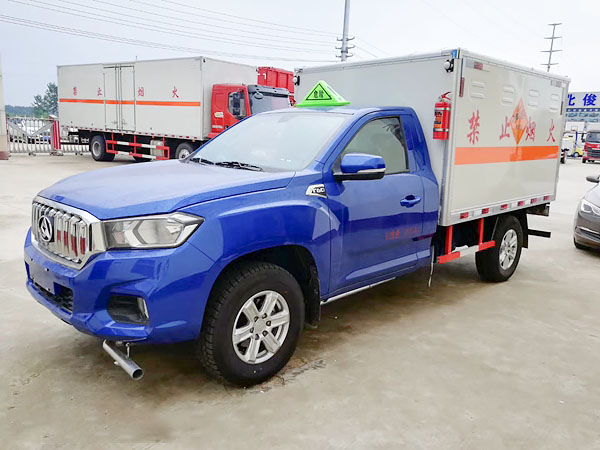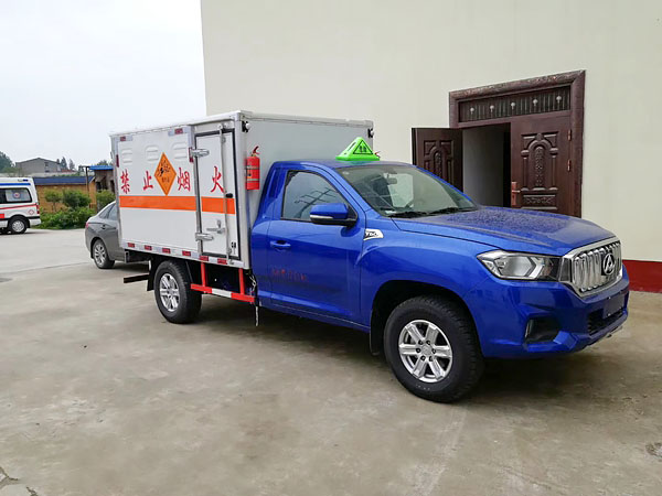 廂體全金屬整體骨架結(jié)構(gòu),外飾冷軋鋼板(隔熱,防靜電),內(nèi)飾鋁板(隔熱,防靜電),中間骨架結(jié)構(gòu)(提高廂體強(qiáng)度),所有箱板內(nèi)部填筑阻燃高強(qiáng)度泡沫板整體高壓粘合鉚接后焊接拼裝成廂型,底板鐵板上鋪設(shè)防靜電膠皮(絕緣,導(dǎo)靜電),前臉底部鋁板上加裝靜電防撞膠皮,內(nèi)飾臥環(huán)(固定貨物定位拉環(huán)),透氣孔,外部帶通風(fēng)孔,保持廂體與外部空氣流通,及時(shí)與外部空氣交換,確保安全,大梁加裝拖地靜電膠帶,把貨物摩擦靜電導(dǎo)入大地。車輛門框配備防盜報(bào)警器,廂內(nèi)頂部安裝煙霧報(bào)警器,前廂板左右立柱安放滅火器,排氣管前置安裝排氣火花熄滅器,駕駛室安裝“危險(xiǎn)品”標(biāo)志燈,車廂外中部粘貼橙色反光帶一周,并在車廂左、右、后安裝“爆炸品”菱形牌3塊,車體后部設(shè)置安全告示牌、“危險(xiǎn)品”黃色警示牌,后保險(xiǎn)杠安裝緩沖加強(qiáng)橡膠塊等。車廂開(kāi)側(cè)門,方便裝卸貨物;可加開(kāi)隔倉(cāng),方便不同性質(zhì)的爆破物品同車分倉(cāng)運(yùn)輸。
