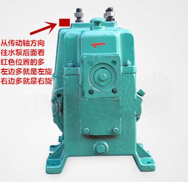 2、如果看不到灑水泵標(biāo)牌,那么就按照張部長教的方法,從水泵傳動軸方向往后看,看看水泵上不進(jìn)水口位置兩次多出來的空間,哪邊多,就是什么旋轉(zhuǎn)的,如下圖,左邊的空間多,那么就是左旋的。國內(nèi)的灑水車水泵廠家,都可以這樣區(qū)分。